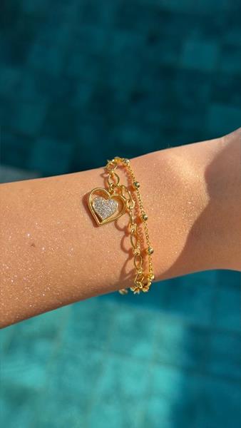 uma com elos e outra com esferas delicadas, unidas por um pingente de coração cravejado em zircônias.