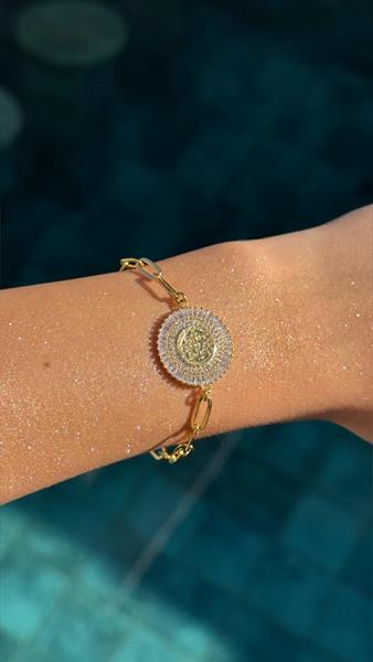 Com um design delicado e sofisticado, essa pulseira traz uma medalha central cravejada com zircônias emoldurando o símbolo de proteção.
