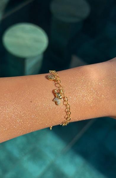 Banhada a ouro, essa pulseira combina dois poderosos símbolos: o elefante cravejado, que representa sorte e sabedoria, e o olho grego cravejado, símbolo de proteção contra o mau-olhado.