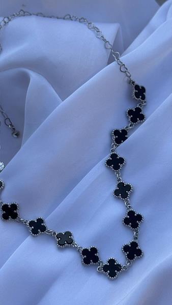 Um colar marcante, que combina o charme do preto com o brilho sutil do metal prateado.
